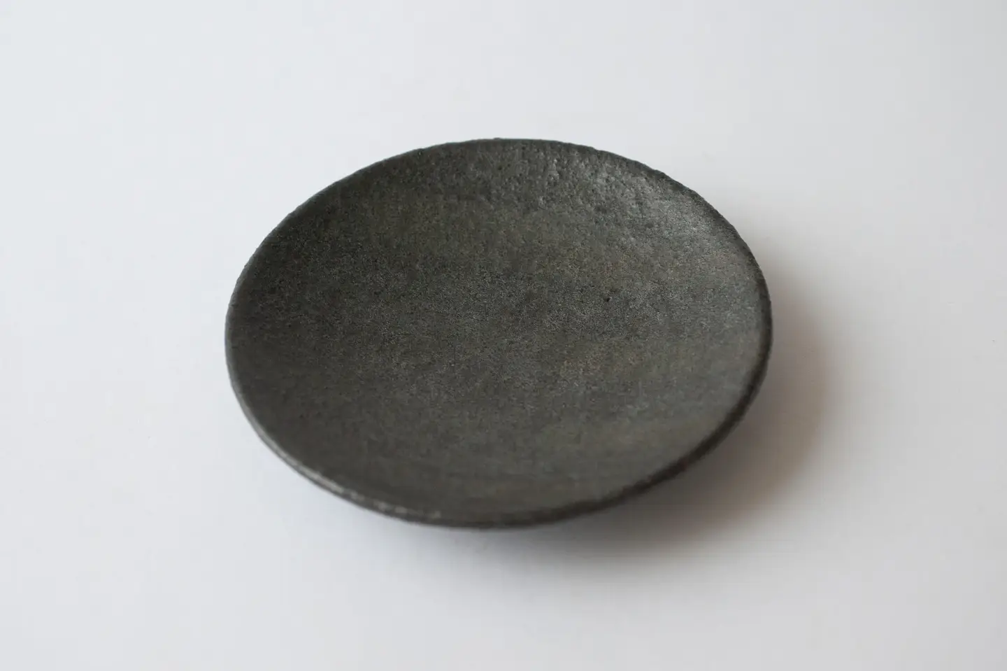 スミ黒の釉薬は、鉄のような表情が絵になり、のせる料理の色をより美しく見せてくれます。