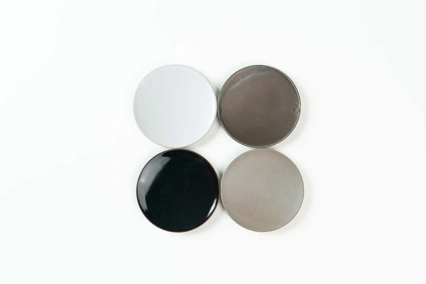 赤土に釉薬をかけることで真っ白ではなくグレイッシュに仕上げています。他の色に比べて表情の変化はほとんどありません。マットな釉薬ですので、金属製カトラリーを使用すると跡(メタルマーク)がつきます。