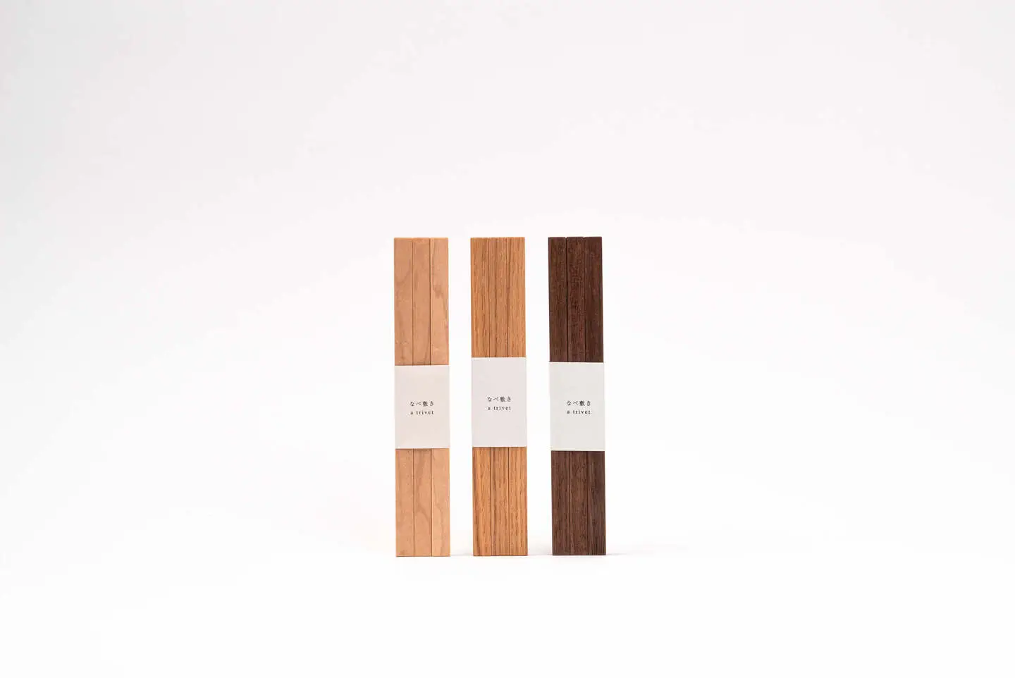 シンプルなアイデアをプラスした鍋敷き。 鍋の大きさに合わない。使わない時に邪魔になる。 そんな不満を、3 本の木で解消します。 三本の並びを変えれば置く鍋の大きさを選ばず、安定感も抜群。 束ねればすっきり、どこにでも収まります。