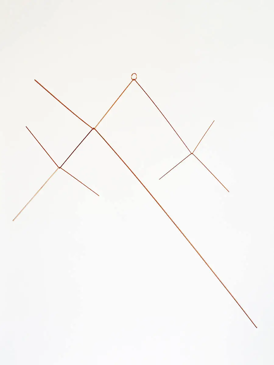 木の枝に引っかかる枯れ枝の揺れる姿を表現した金属製モビール。